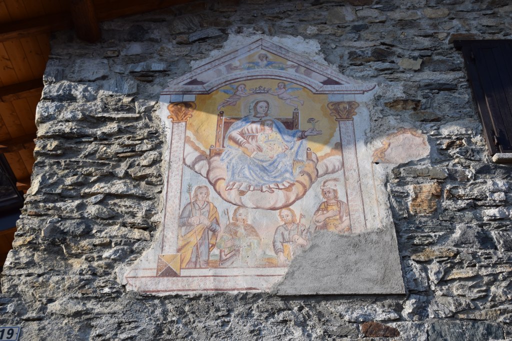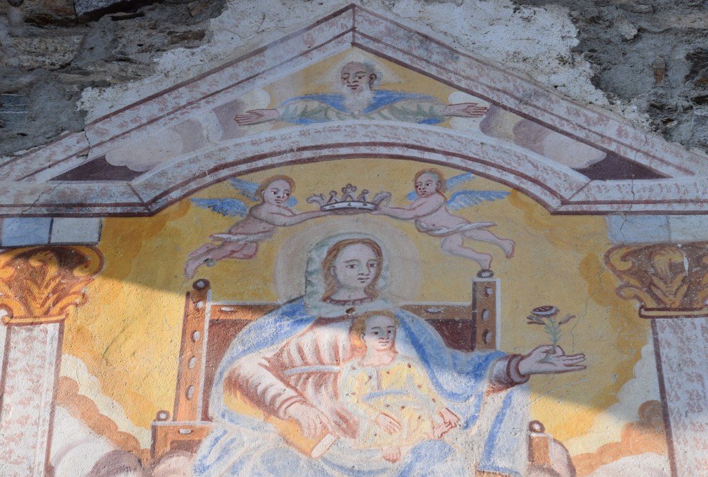 The beautiful 18th-century Coronation of the Virgin. The Madonna sits on a throne that floats in the clouds. The Great Virgin is crowned by cherubs and her enthronement is overseen by God the Father. In her right hand Mary holds a gospel and in her left a flower that I would like to say is a rose but it has two different types of leaves – of a lily and of a mum – and a detailed flower-head, which is not familiar to me. To Mary’s left are a soldier saint who looks like Saint Julian the Hospitaller and another male saint who might be Saint Paul. To Mary’s right is Saint Joseph and a male saint who might be Saint Martin. The fresco is fresh and it may have been restored at least once. The imagery is too ‘simple’ to be original and the bold outlines used are indicative of a restoration. This fresco was worth the trip here!