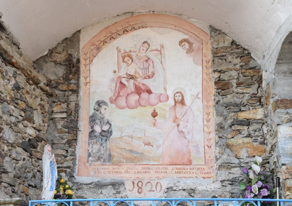 The previous photo documents a church in the village of Bugiallo the dedicatory saint of which is San Gaetano. The saints in frescoes can serve multiple representative purposes. For example, frescoes on private homes or frescoes in churches that were paid for by private donors often feature onomastic saints with whom donors share names. The dedicatory saints of the village, also, feature in frescoes as well as saints that can be invoked for protection against illness or for professions common to an area.