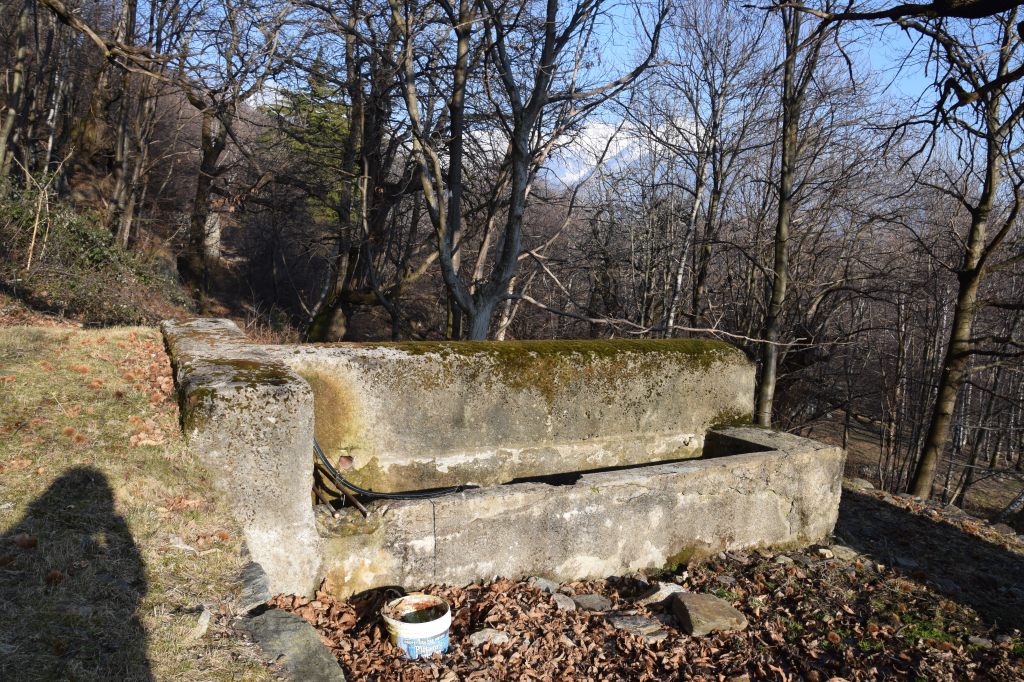 This is the historic Lavatoio Communale of Peledo. It is double-sided with one side for the collection of water and the other for washing laundry. There is a very large chestnut tree in front of it. The wash-basin sits in the middle of the remaining homes – one bank of homes on the road leading to the mountain località San Bartolomeo at well over 1000 meters and the other on a road leading to the Chiesa San Miro in Sorico.