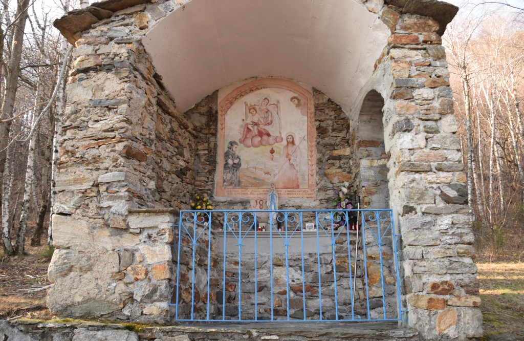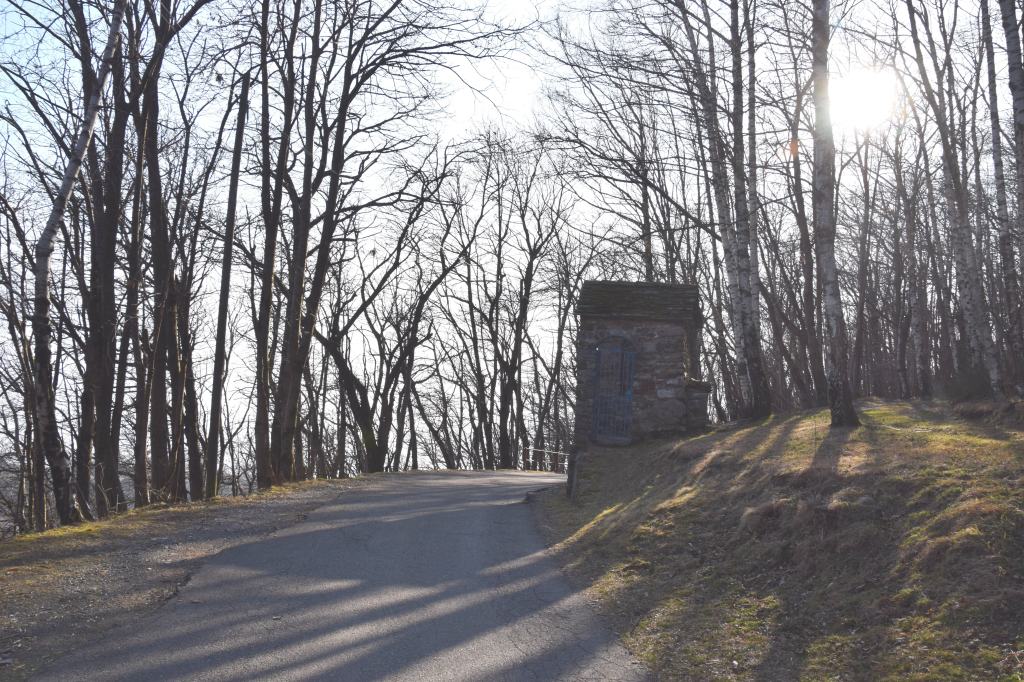 This is a view looking back down the road toward Bugiallo. One can see the shrine on the side of the road. All the roads around the lake have these shrines – mulattiere, sentieri, percorsi, and carriage roads – have shrines like these. They offer the blessings of the Catholic faith to those who pass by and a respite from one’s journey.