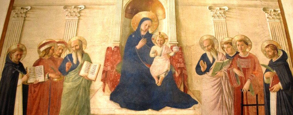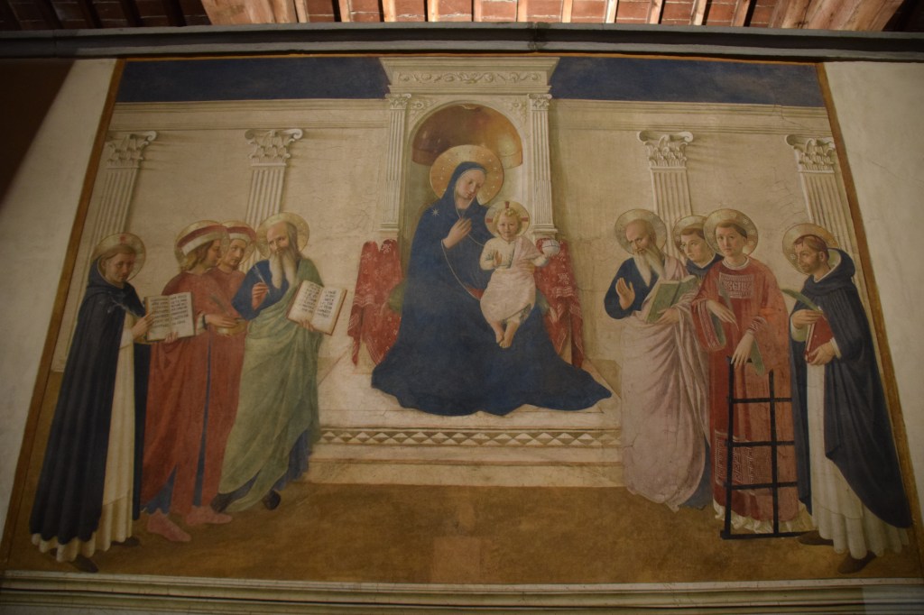 Fra Angelico’s fresco features eight saints – some dear to the Dominicans and some to Cosimo de’Medici – and an enthroned Madonna and Child. The saints, who are engaged in a silent interaction with each other, are organized in two symmetrically situated groups and they all occupy the same space with the enthroned Madonna and Child.