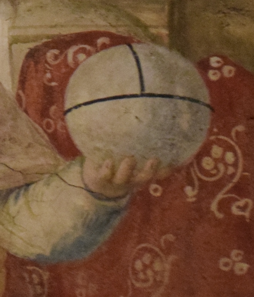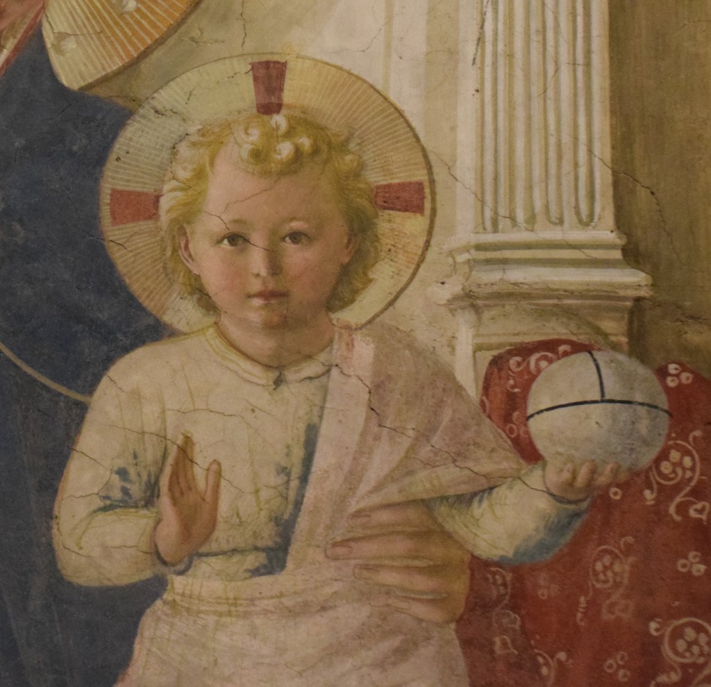 The Globus Cruciger – a cross-bearing orb – in Jesus’ hand lacks the cross normally found on the top which symbolizes his sacrifice and crucifixion. However, because the globe in Jesus’ hand bears the linear divisions associated with the symbol, one might posit that the omission of the cross – intentional to the artist – is meant to speak to the coming sacrifice rather than its completion. Perhaps Fra Angelico draws us into the need to live a Christian life in line with the teachings of Domenico and the gospels in order to experience the triumph of Christianity which Christ’s crucifixion represents – the path to the eternal life promised the faithful. Accepting that proposition, one would be warranted in calling the orb a Globus Cruciger and not a simple ‘ball’.