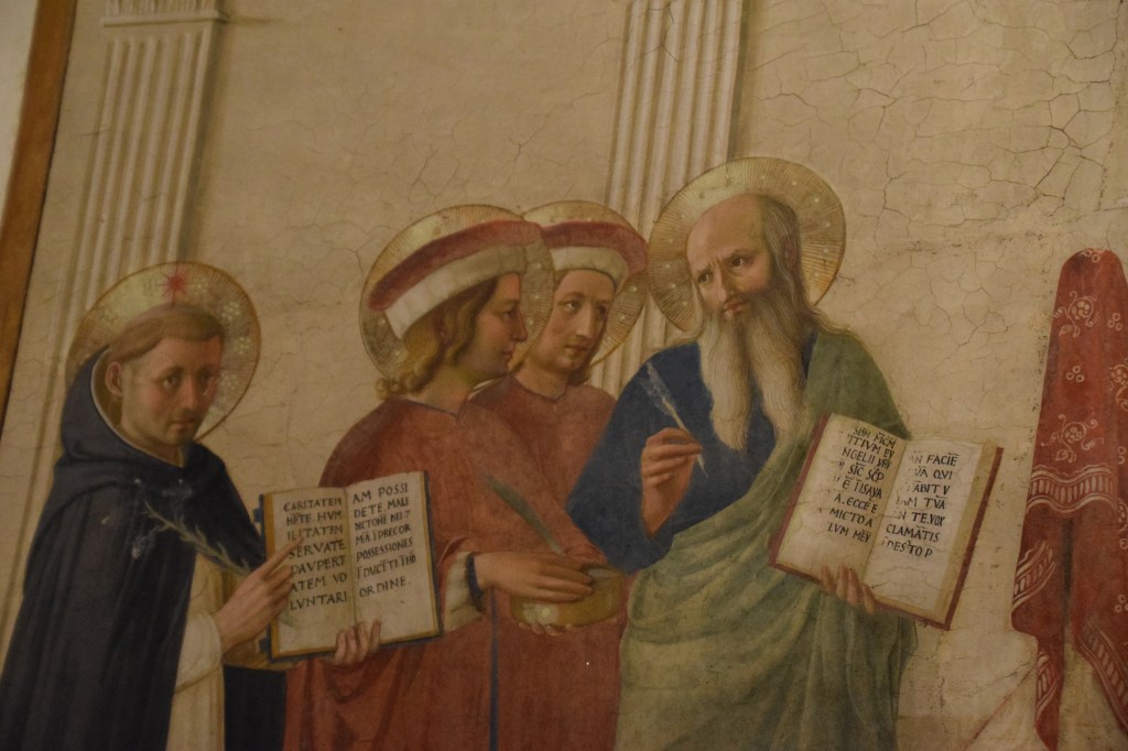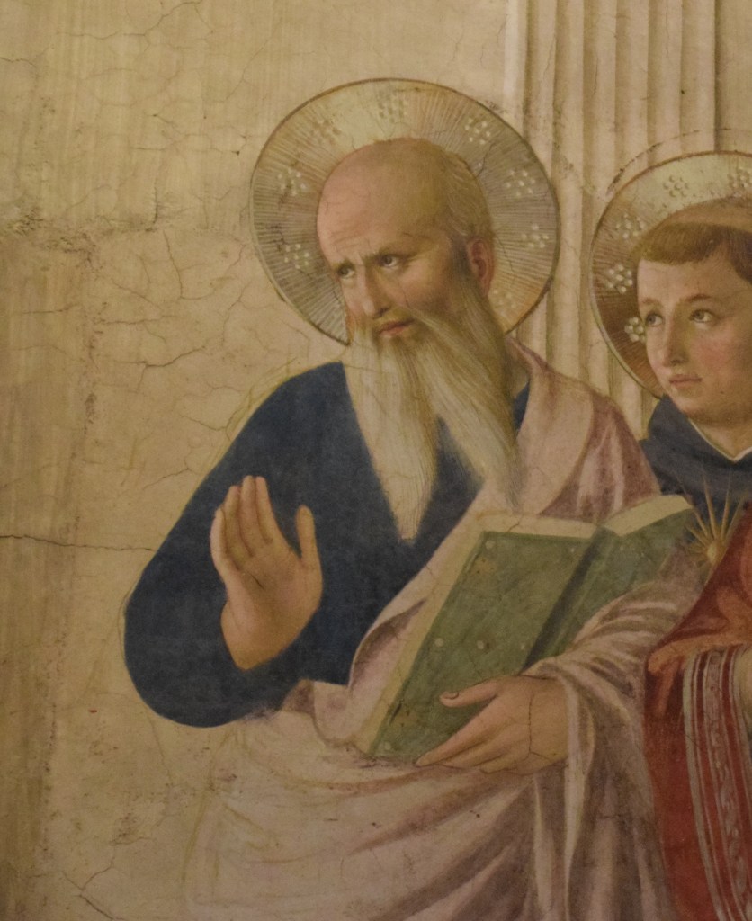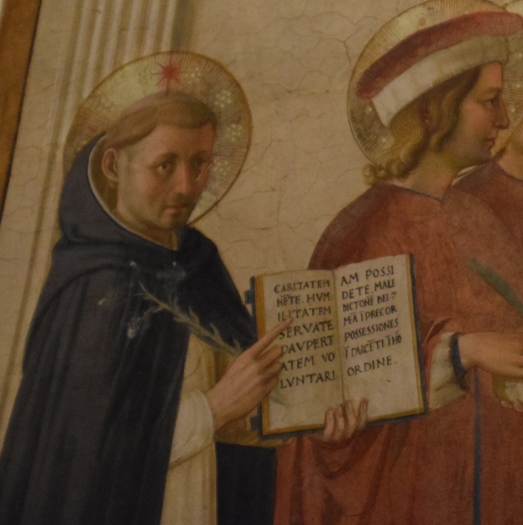 There are three holy persons who greet or ‘converse’ with the viewer’s eyes – one in each of the three groups that compose the fresco. With the exception of the Madonna whose eyes caress the young Jesus, Fra Angelico directs the gazes of all other saints to the order’s founder – San Domenico. To the viewer’s left the eyes of Domenico – founder of the order – greet us and direct our gaze to his invocation written in Latin on the open page of the book he holds.