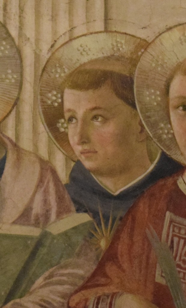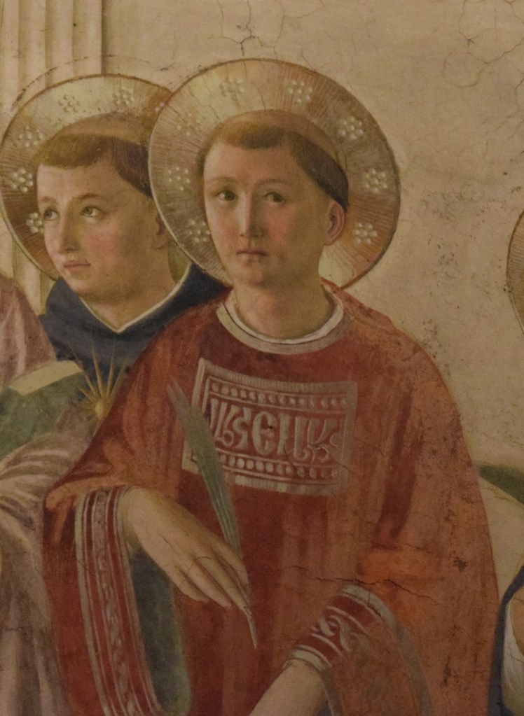 SAN LORENZO (225-258 A.D.) is the protector saint of Lorenzo de’Medici the Elder (1394-1440) and his name saint. Lorenzo the Elder is the younger brother of Cosimo de’Medici the donor. Fra Angelico depicts Lorenzo with the instrument of his martyrdom – the grill on which he was burned. With artistic preference and freedom, the artist, also, paints Saint Lawrence in the traditional garb of the protomartyr. (The rectangular inset of the robe of San Lorenzo appears to have letters on it. I am consulting an expert to confirm and translate them.)