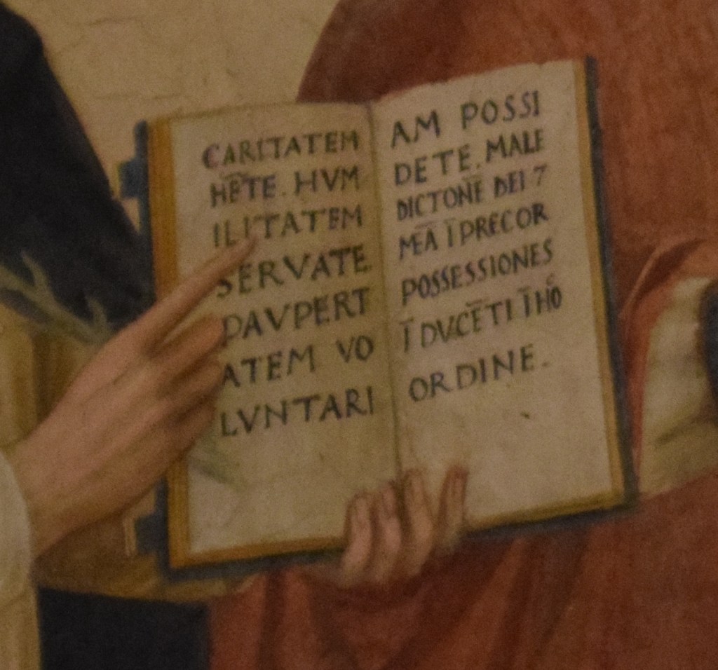 English: “Have charity, observe humility, possess voluntary poverty. I implore the curse of God and mine on those who introduce possessions in this order.”