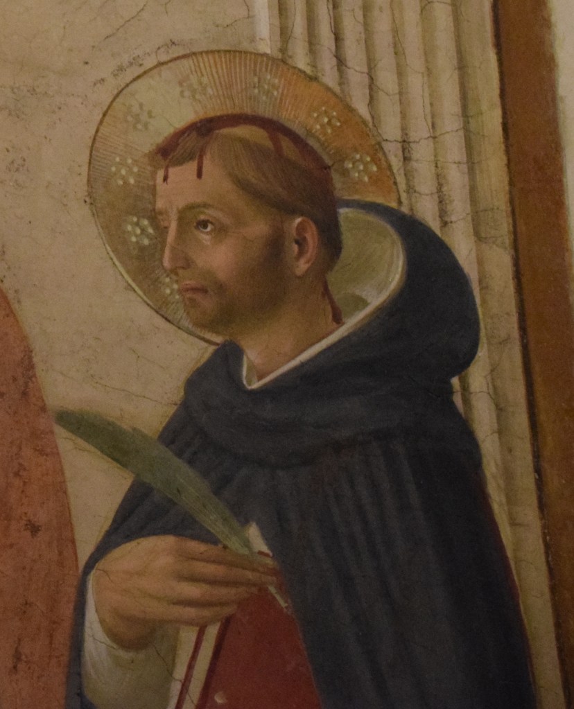 This is an astonishing and colorful work that represents saints dear to the Dominicans and to Cosimo il Vecchio de’ Medici, the donor and founder of the Medici family dynasty who has honored both his family and the Dominican order in the commission. Originally, I had planned to simply post one photo of this fresco with a brief explanation of the included saints. But as I became more familiar with the work and each individual depicted, I began to realize that a simple explanation could not do even partial justice to the intentionality of this master work. I am not certain of the completeness of my discourse, but I hope it engenders a greater appreciation of the colors that can both bring delight and yet serve to detract the viewer from the richness of the artist’s narrative. However, to fully appreciate the talent of Fra Angelico and the heart of Cosimo de’Medici a personal visit to the museum is needed. I hope that you find this fresco as beautiful as its long life and fame attests.